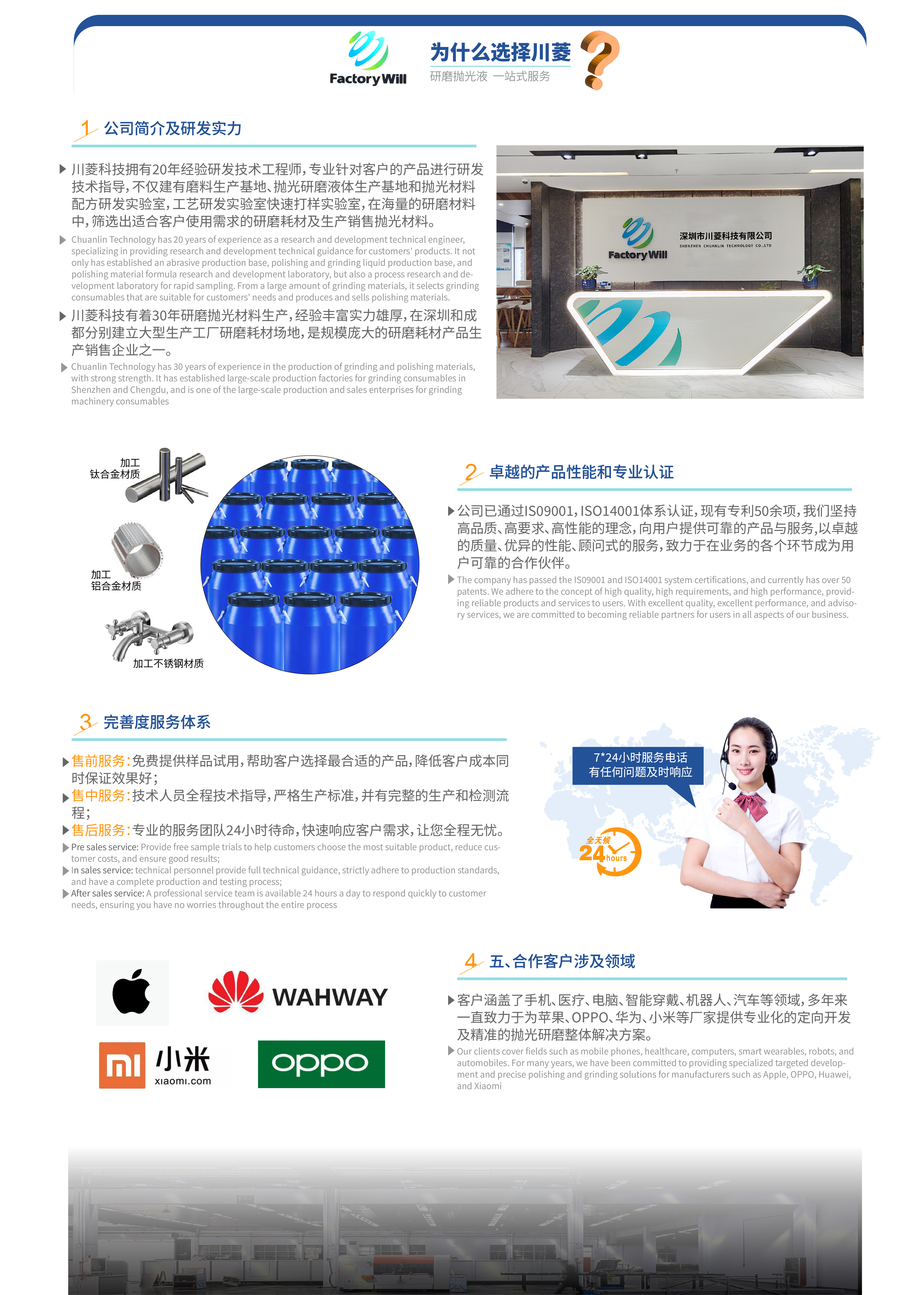 深圳市川菱科技有限公司是一家集研發(fā)、生產(chǎn)和銷(xiāo)售拋光研磨耗材為一體的企業(yè),公司擁有30年行業(yè)經(jīng)驗(yàn),公司以雄厚的技術(shù)力量、尖端的產(chǎn)品為核心、以專(zhuān)業(yè)的研發(fā)團(tuán)隊(duì)為支撐,深耕拋光研磨行業(yè),多年來(lái)致力于為蘋(píng)果、OPPO、華為、小米等客戶(hù)提供專(zhuān)業(yè)、精準(zhǔn)的拋光研磨解決方案。